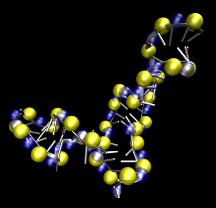 Nucleic acids (DNA and RNA) are highly charged biopolymers. Under physiological conditions, systems involving nucleic acids also contain positively-charged counterions in solution such at Mg2+ and K+. For a long time, these counterions were thought to act merely as the enforcers of charge neutrality. It is now clear that counterions serve a much larger function. Counterions can stabilize the folding of RNA, can mediate the effective attractive interactions of DNAs during packaging and can modulate peptide-DNA and peptide-RNA interactions. The picture to the left shows how Mg2+ ions (yellow) are typically correlated with the backbone of a RNA under physiological salt conditions (~ 1 mM Mg2+).